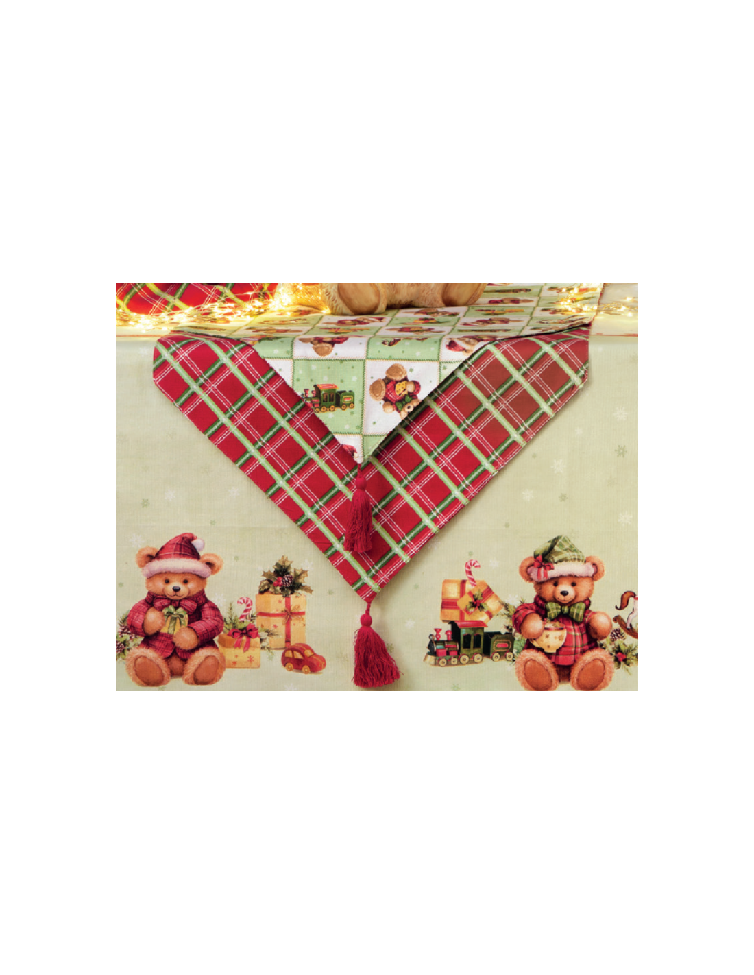 Striscia doppia a punte, realizzata in tessuto fantasia con un lato a tema orsetti e l’altro in classico tartan. Rifinita con eleganti nappe rosse alle estremità. Dimensioni: 45X140 cm Materiale: Cotone Collezione: Coccole